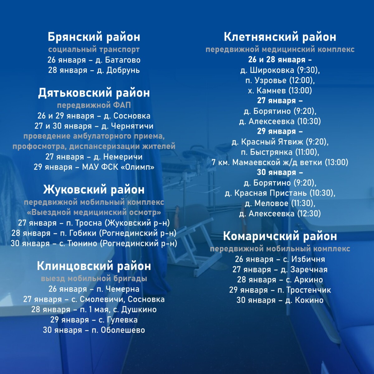 График работы в Брянской области передвижных медицинских комплексов с 26 января по 1 февраля