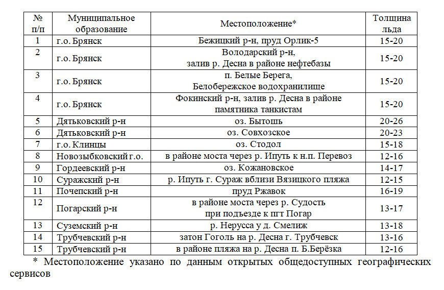 Данные МЧС по толщине льда на озерах и реках Брянской области