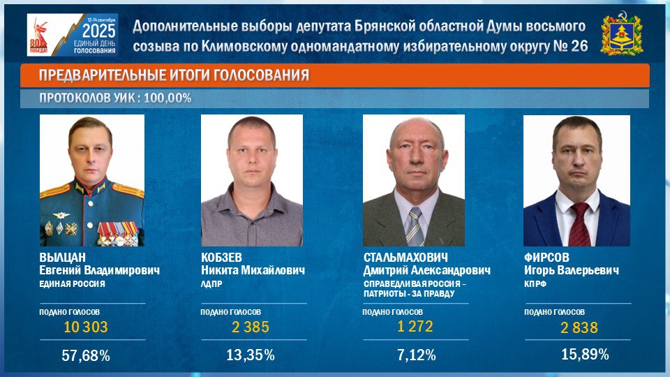 В дополнительных выборах депутата Брянской областной Думы восьмого созыва по Климовскому одномандатному избирательному округу № 26 победил Вылцан Евгений Владимирович, набравший 57,68 %,