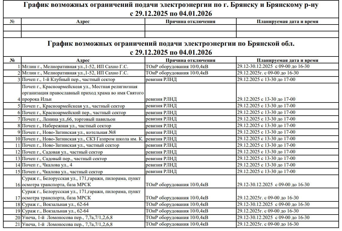 Плановые отключения электричества в Брянской области
